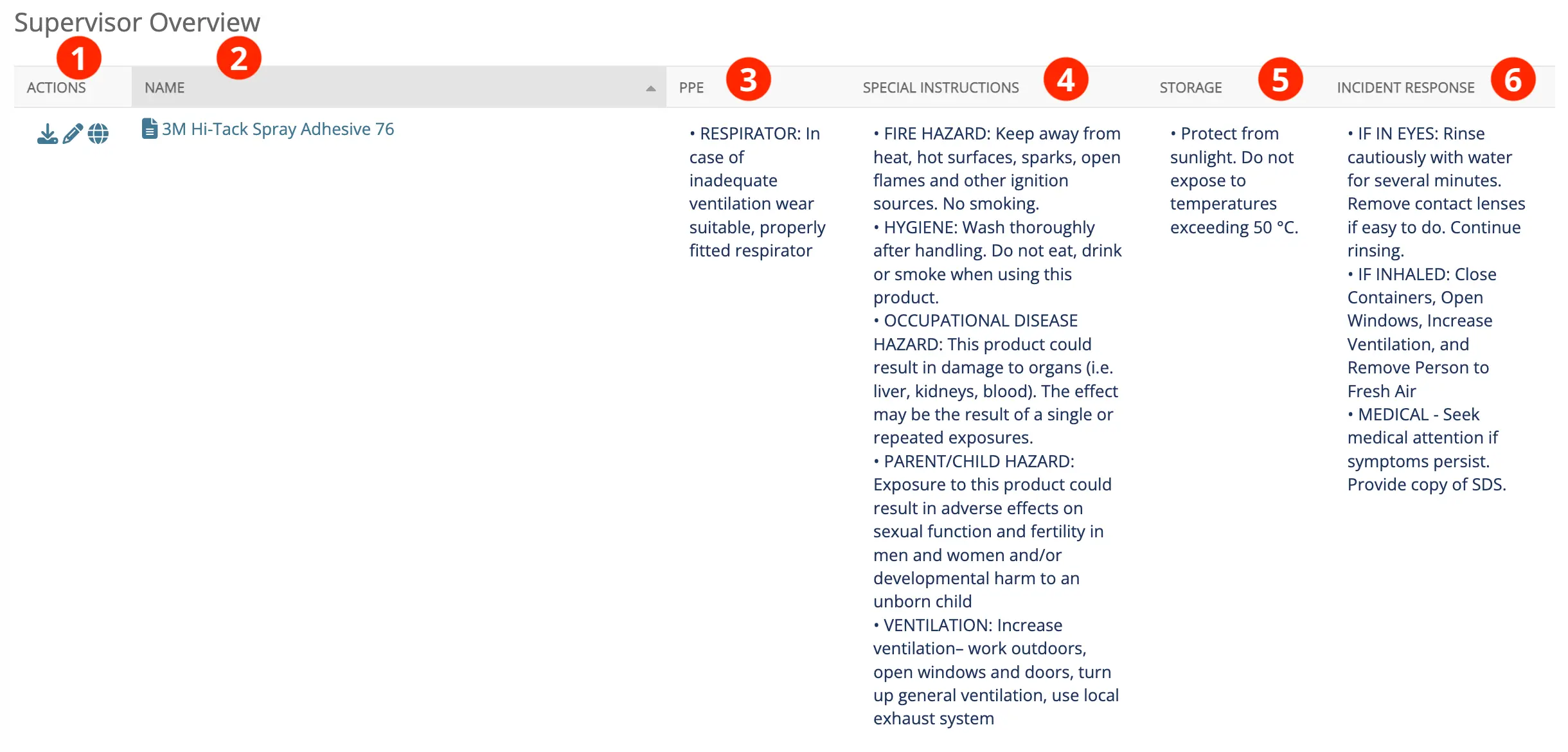 1. Actions: Click on this link to download the safety data sheet or edit the information associated with it or see where it is being used. Allows easy access to the full product information for cross-reference.